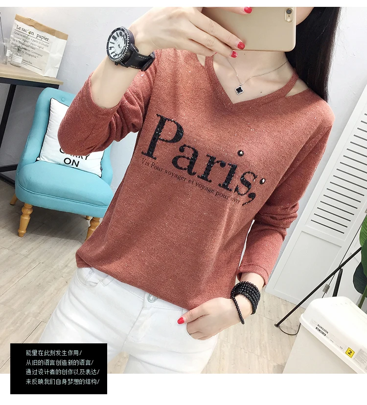 Tee Shirt Femme V-Neck T-Shirt Women Clothes 2022 Autumn Casual Diamonds Letter Tshirts Long Sleeve Tops Korean Woman Clothing